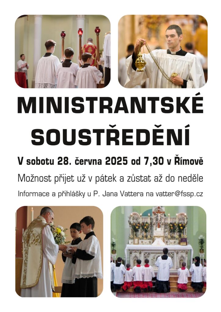 Chceš se zlepšit v ministrování nebo se naučit ministrovat? Tak přijeď v sobotu 28. června 2025 (od 7,30) do Římova na ministrantské soustředění. Můžeš přijet už v pátek a zůstat až do neděle. V tom případě si s sebou vezmi spacák a věci potřebné na přespání. Bližší informace a přihlášky u P. Jana Vattera: https://fssp.cz/p-jan-vatter-fssp/